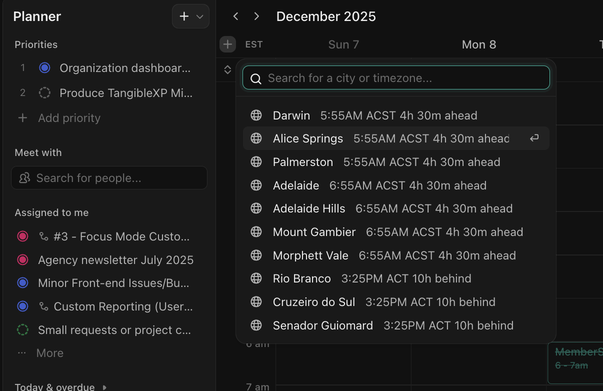 You can add additional timezones to the calendar by clicking the small "+" icon above the planner's time column.