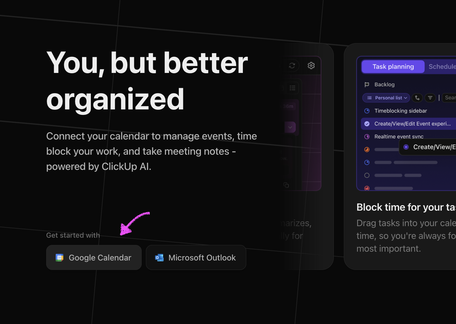 The first time you visit the Planner, you'll be prompted to set up a calendar integration. Click the "Google Calendar" button to integrate with your calendar. Once you've done this your scheduled meetings will appear in ClickUp.