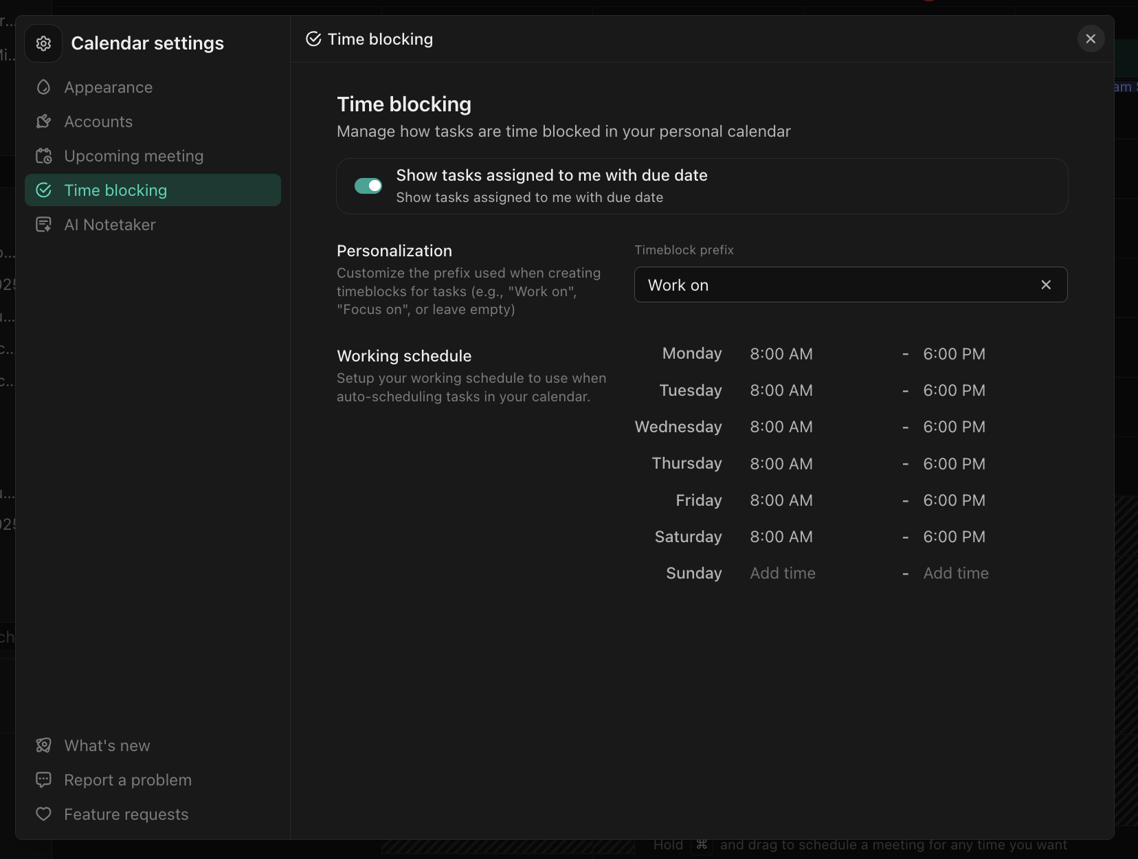To ensure that AI planning features work correctly and that other team members don't schedule tasks and meetings outside of your active hours, customize your work hours according to your usual weekly availability. These settings can be found in Planner settings -> Time Blocking